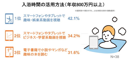 入浴時間の活用でも同様の傾向が見られ、入浴中の時間を週2回以上「身体を温める・身体を洗う」以外に使っている人の全体の結果は18.1%に対し、年収800万円以上の層は23.5%と平均を上回りました※7。なかでも入浴中の時間の使い方として年収800万円以上の層は、「スマートフォンやタブレットでビジネス・学習系動画を視聴」というインプット・学習に関する行動が34.2%(全体での結果は26.7%)という結果になり、約3人に1人に達していました※11。