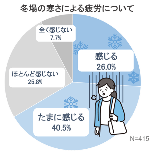 ※4「感じる」、「たまに感じる」、「ほとんど感じない」、「全く感じない」から単一選択方式。「冬場の寒さが原因で、疲労がたまりやすいと感じますか。」という質問に対して、「感じる」、「たまに感じる」と回答した人の合計