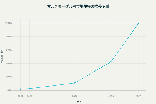 ▼マルチモーダルAI市場の成長トレンド(2024年18億ドル→2037年989億ドル)と地域別・産業別の詳細内訳を理解