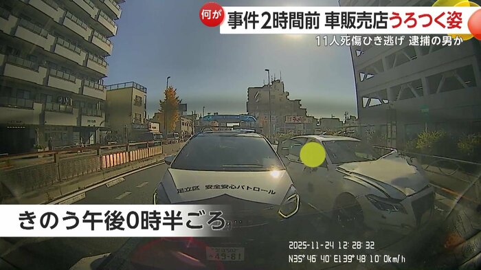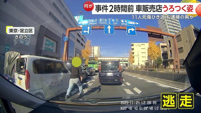 24日午後0時半ごろ、東京・足立区で自動車販売店から盗まれた車が歩行者などを次々とはね、11人を死傷させるひき逃げ事件が発生。事故を起こした車を盗んだ疑いで、37歳の男が逮捕された。その後の捜査関係者への取材で事故現場には、ブレーキ痕がなかったことが分かった。自動車販売店の近くの防犯カメラには男とみられる人物がうろついている様子が映っていた。