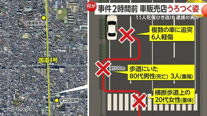 東京・足立区で盗難車が歩行者らを次々とはね、11人が死傷したひき逃げ事件。