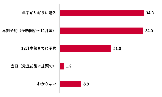 購入時期は「年末ギリギリに購入」(34.3%)と「早期予約(予約開始~11月頃)」(34.0%)が拮抗している。