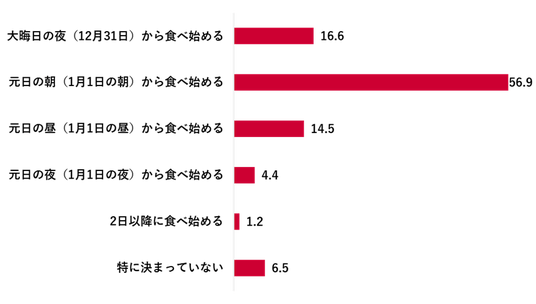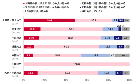 おせちを食べるタイミングは「元日の朝から」が56.9%で最多だったが、北海道・東北地方では「大晦日の夜から」が48.6%と地域差が見られた。