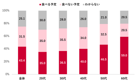 年代別では、20代の「食べる予定」が35.0%にとどまった。年代が上がるほど高くなり、60代では59.0%と、世代による差が顕著に表れた。