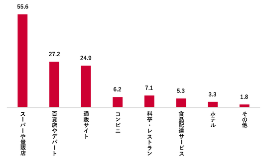 購入先は「スーパーや量販店」(55.6%)が最多で、「百貨店やデパート」(27.2%)、「通販サイト」(24.9%)が続いた。