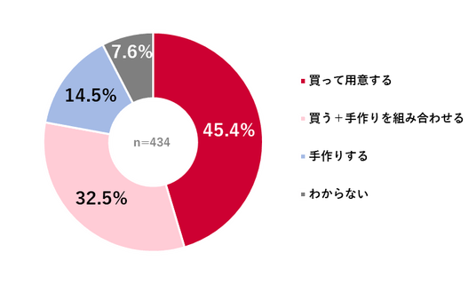 おせちの準備方法について聴取したところ、「買って用意する」が45.4%、「買う+手作りを組み合わせる」が32.5%となり、合わせて77.9%が何らかの形で購入すると回答した。「手作りする」は14.5%だった。