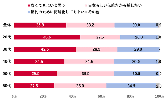 物価高が続く中での「おせち」の存在意義については、「なくてもよいと思う」が全体の35.9%だった。「日本らしい伝統だから残したい」が33.2%、「節約のために簡略化してもよい」が30.0%と、三者が拮抗した。年代別では20~30代で“不要派”が4割を超え、50~60代では“伝統派”が約4割だった。