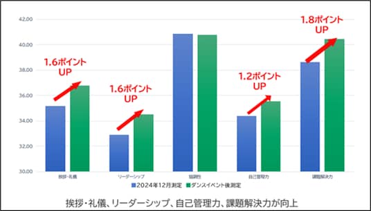 「イクスピアリ」でのダンス発表会に参加した子どもたちの非認知能力が向上し、中でも挨拶・礼儀、リーダーシップ、自己管理力、課題解決力が伸びたことがわかりました。