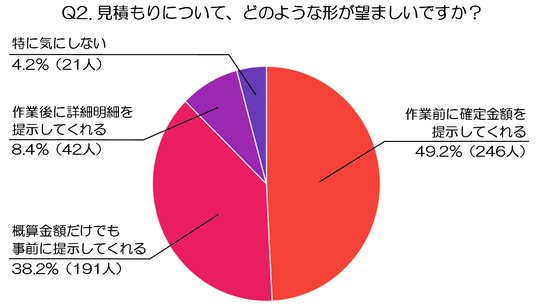 - 一方で、「作業後に詳細明細を提示してくれる」(8.4%)は比較的少なく、費用の把握が作業後になる形式は不安を十分に解消できないと感じられているようです。また「特に気にしない」(4.2%)はごく少数で、多くの利用者が費用の透明性を重視している点がはっきり表れた結果といえます。