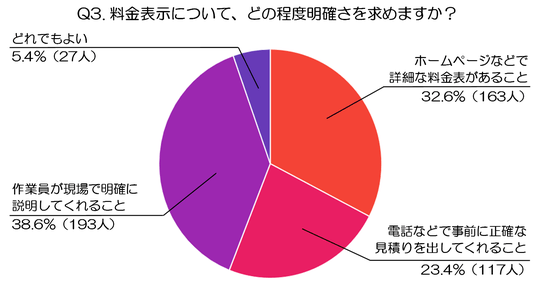 - 一方で「どれでもよい」(5.4%)は少数にとどまり、料金表示に対する利用者の関心が総じて高いことがわかります。料金の明確さは業者選びにおいて欠かせない要素となっており、多くの利用者が“納得できる説明”や“事前の情報提供”を求めていることが、この結果から強く示されています。