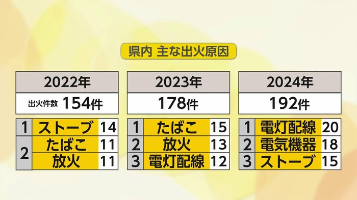 過去3年に県内で起きた火事の主な出火原因では、電気コードやタバコなどとともに、「ストーブ」が火元となる火事が毎年多く発生しています。
