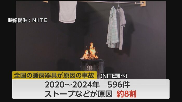 NITE(製品評価技術基盤機構)によりますと、全国では暖房器具による事故が去年までの5年間で596件発生。このうちおよそ8割が電気ストーブや石油ストーブなどが原因となっています。