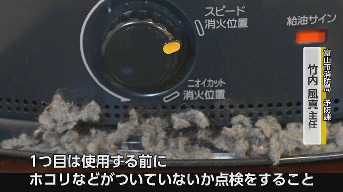 「基本的な注意点としては3つ。1つ目は使用する前にホコリなどがついていないか点検をすること。2つ目が外出時や就寝時は火をしっかりと消すこと。3つ目は古い灯油などは使用しないこと。特に注意すべき点として衣類や布団などの可燃物はストーブの前に置かないということ。もう1つ給油時は必ず(火を)消してから行うということを守ってほしい」