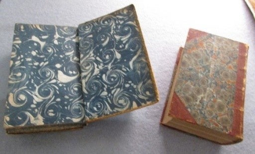 *画像:マーブル紙表紙の本(右側)、見返しと小口(左側)にマーブル文様を施した本(上海 1865年)紙の博物館提供