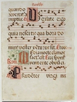 引用画像:[パーチメント楽譜 (ヨーロッパ 17世紀頃) 4本の譜線にネウマと呼ばれる記号を用いて書かれた聖歌の楽譜、彩色は手描き)]