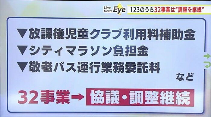 市は各事業の関係者への聞き取りで反対意見もあったことから、放課後児童クラブ利用料補助金や盛岡シティマラソンなど32の事業については協議や調整を継続するとの方針を示した。