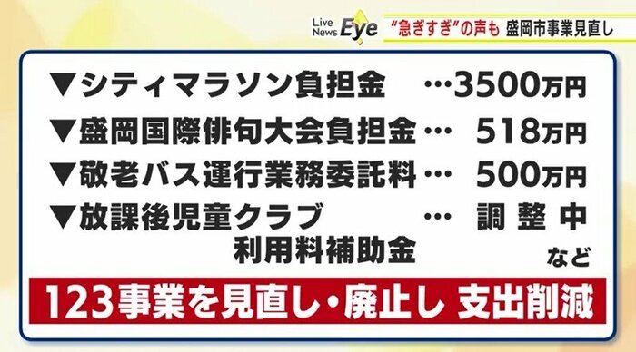 財源確保などを目的に盛岡市が見直しを進めている123の事業について、10月24日に示された方針によると、いわて盛岡シティマラソンの負担金3500万円、老人クラブなどが利用する敬老バス運行業務委託料500万円、放課後児童クラブの利用料補助金(額は調整中)などの事業について、見直しや廃止を行うことで支出を削減する方針だ。