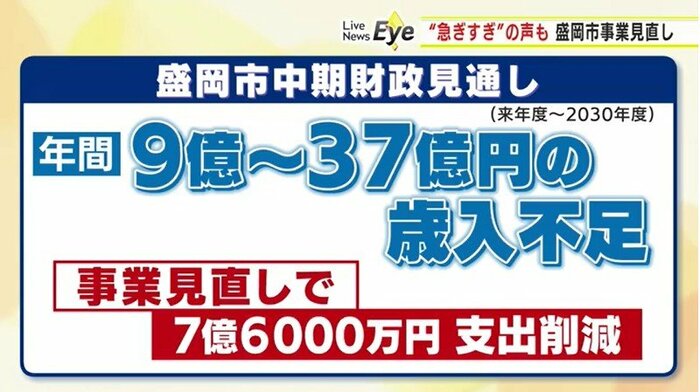 岩手県盛岡市が財源確保などを目的に123の事業見直しを進めている。市民生活に関わる事業も含まれており、議会や市民からは慎重な対応を求める声が上がっている。背景には5年後に財政調整基金がマイナス予測という深刻な財政状況がある。