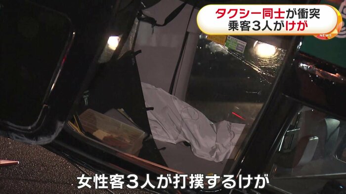 この事故で、直進してきたタクシーに乗っていた女性客3人が打撲するケガをして病院に運ばれました。