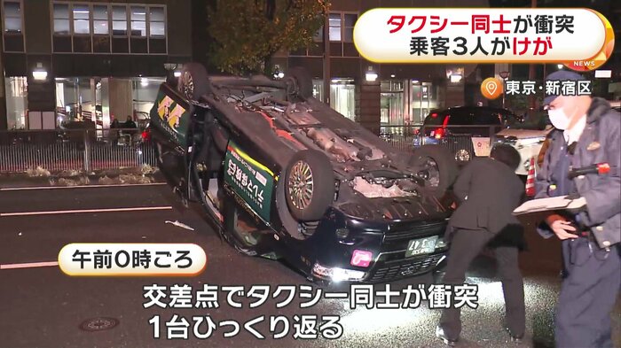 東京・新宿区でタクシー同士が衝突し、3人がケガをしました。