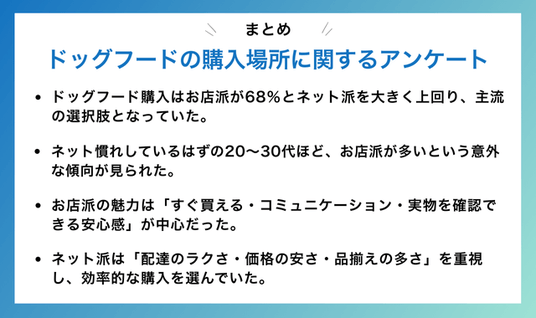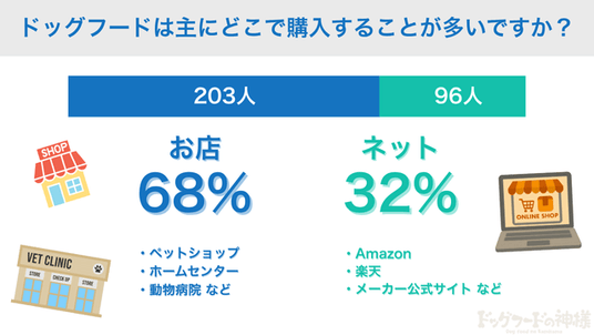 - ドッグフード購入はお店派が68%とネット派を大きく上回り、主流の選択肢となっていた。