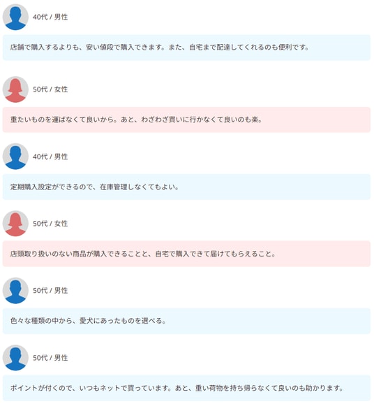 ネット購入を選ぶ飼い主さんの間では、どのような点がメリットとして評価されているのでしょうか。ここでは、回答結果からまとめたランキングと、実際の利用者によるコメントの一部をお伝えしていきます。