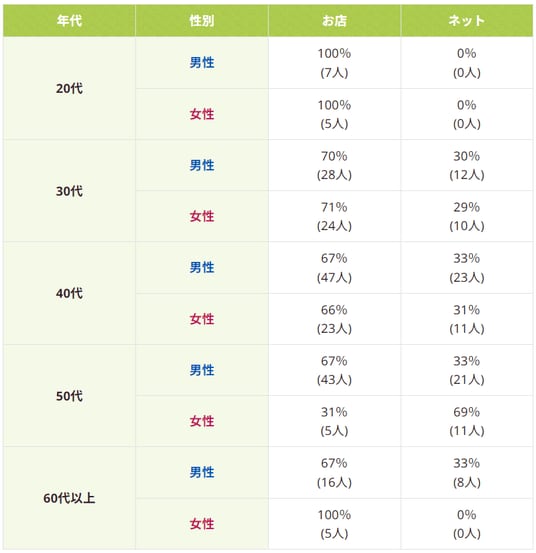 一方で、50代・60代以上の女性では、店舗派とネット派が分かれ、数値にばらつきが確認されました。年代が上がるほど、こだわりや価値観が多様化している可能性が考えられます。