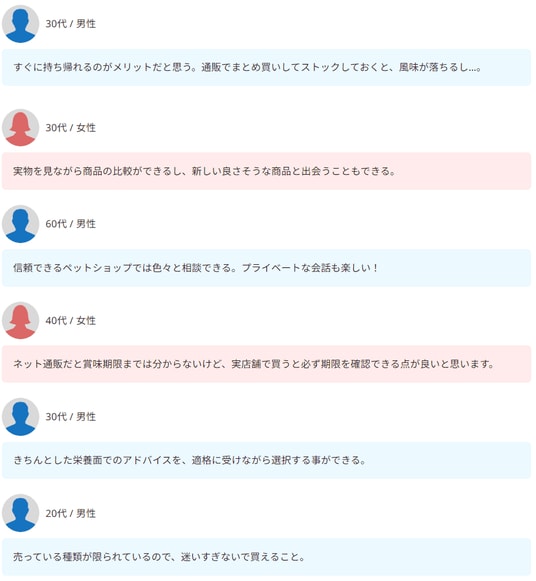 まずは、店舗でドッグフードを購入している方々に、実店舗を選ぶ理由について回答をいただきました。記事の後半では、具体的なコメントやエピソードも紹介していますので、あわせてご覧ください。