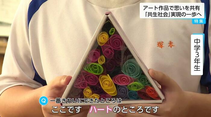 制作した中学3年生は、「楽しくてうれしい気持ちになります」と語り、ハートの形にできた部分を一番きれいにできたところだと話した。