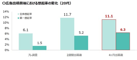 検証の結果、継続出稿により当該カテゴリー内における純粋想起※1、ならびに第一想起※2が上昇することが確認できました。