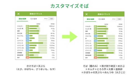 AI食事管理アプリ『あすけん』上での、「かけそば+天ぷら」メニューと「カスタマイズそば」の栄養グラフの比較
