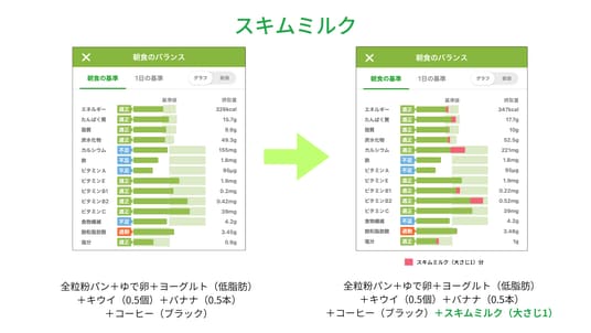 朝食のメニューに「スキムミルク(大さじ1)」を足した場合の栄養グラフの比較