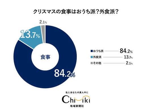 「クリスマスの食事はおうち派? 外食派?」という質問に対し、なんと「おうち派」が84.2%という圧倒的勝利を収めました。『ちいき新聞』の読者にはファミリー層やシニア層が多く、人数が多いとクリスマスの日に対応できる飲食店を見つけるのもひと苦労だったり、近頃の物価高でファミリー層には支出がかさんだりといった理由が考えられます。