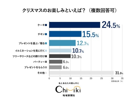 クリスマスのお楽しみは「ケーキ」「チキン」と、クリスマスならではのメニューが1位と2位にランクイン。「プレゼントを選ぶ/贈る」が12.7%で3位だったことに対して、「プレゼントをもらう」が6%で7位という興味深い結果になりました。「プレゼントはもらうよりも選ぶほうが楽しい」と感じている人が多いことが分かります。
