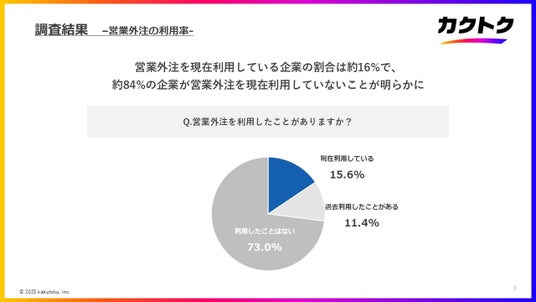 ・営業外注を現在利用している企業の割合は約16%で、約84%の企業が営業外注を現在利用していないことが明らかに。