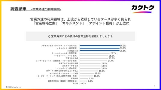 ・営業外注の利用領域は、上流から依頼しているケースが多く見られ、「営業戦略立案」「マネジメント」「アポイント獲得」が上位に