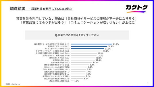 ・営業外注を利用していない理由は「自社商材やサービスの理解が不十分になりそう」「営業品質にばらつきが出そう」「コミュニケーションが取りづらい」が上位に
