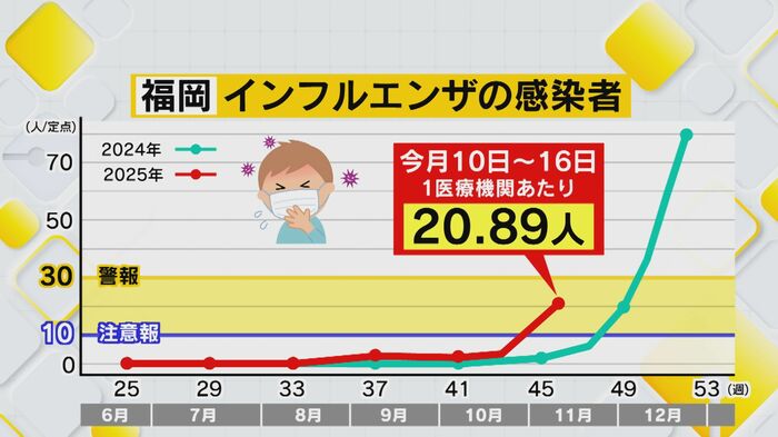 早くもインフルエンザが猛威をふるう福岡県内。11月13日には、昨シーズンより3週間早く『注意報』が発表された。最新の情報では、1医療機関あたりの感染者数が「20・89」と、前の週の約1.6倍に増加している。
