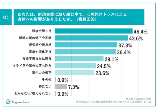 「Q3.あなたは、新規事業に取り組む中で、心理的ストレスによる身体への影響がありましたか。(複数回答)」(n=110)と質問したところ、「頭痛や肩こり」が46.4%、「睡眠の質の低下や不眠」が43.6%、「疲労感や倦怠感」が37.3%という回答となりました。*9割超については、その他、特にない、わからない/答えられないを除いた数値