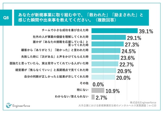 「Q8.あなたが新規事業に取り組む中で、「救われた」「励まされた」と感じた瞬間や出来事を教えてください。(複数回答)」(n=110)と質問したところ、「チームで小さな成功を喜び合えた時」が39.1%、「社外の人が事業の価値を理解してくれた時」が29.1%、「誰かが『あなたの挑戦を応援している』と言ってくれた時」が27.3%という回答となりました。