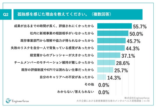 Q1で「頻繁に感じた」「時々感じた」と回答した方に、「Q2.孤独感を感じた理由を教えてください。(複数回答)」(n=70)と質問したところ、「成果が出るまでの時間が長く、評価されにくかったから」が55.7%、「社内に新規事業の相談相手がいなかったから」が50.0%、「既存事業部門から理解や協力が得られなかったから」が45.7%という回答となりました。