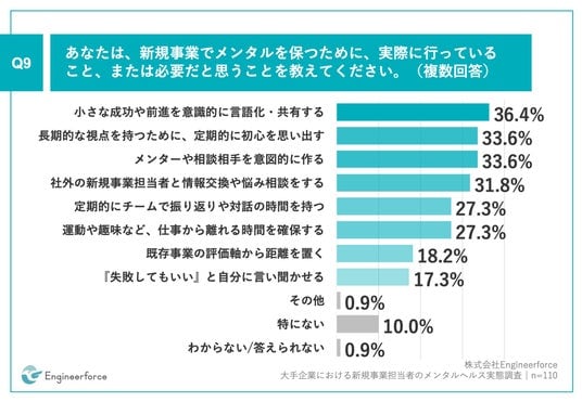 Q9.あなたは、新規事業でメンタルを保つために、実際に行っていること、または必要だと思うことを教えてください。(複数回答)