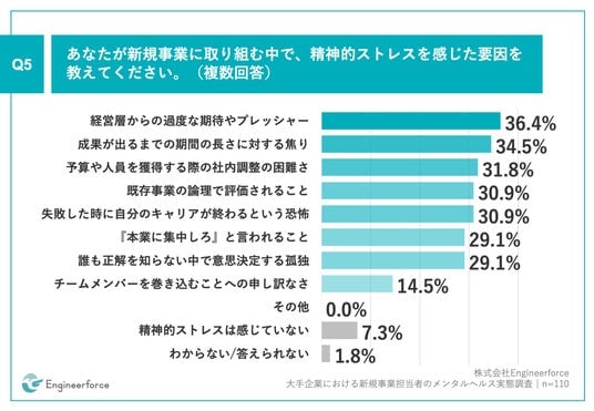 「Q5.あなたが新規事業に取り組む中で、精神的ストレスを感じた要因を教えてください。(複数回答)」(n=110)と質問したところ、「経営層からの過度な期待やプレッシャー」が36.4%、「成果が出るまでの期間の長さに対する焦り」が34.5%、「予算や人員を獲得する際の社内調整の困難さ」が31.8%という回答となりました。