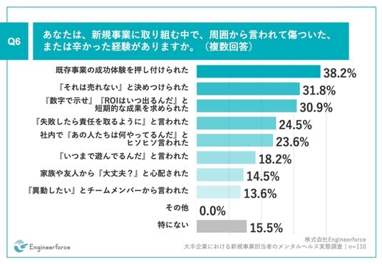 「Q6.あなたは、新規事業に取り組む中で、周囲から言われて傷ついた、または辛かった経験がありますか。(複数回答)」(n=110)と質問したところ、「既存事業の成功体験を押し付けられた」が38.2%、「『それは売れない』と決めつけられた」が31.8%、「『数字で示せ』『ROIはいつ出るんだ』と短期的な成果を求められた」が30.9%という回答となりました。