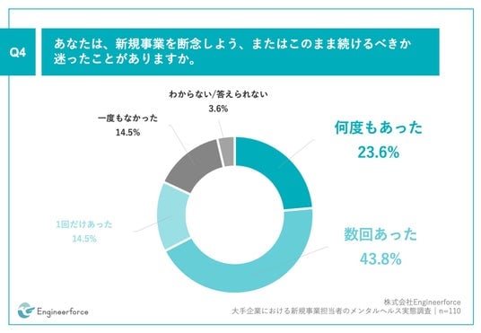 「Q4.あなたは、新規事業を断念しよう、またはこのまま続けるべきか迷ったことがありますか。」(n=110)と質問したところ、「何度もあった」が23.6%、「数回あった」が43.8%という回答となりました。