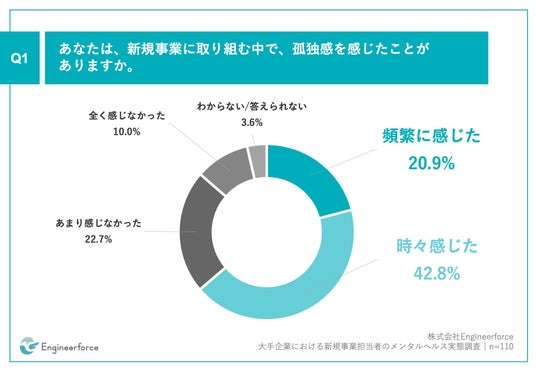 「Q1.あなたは、新規事業に取り組む中で、孤独感を感じたことがありますか。」(n=110)と質問したところ、「頻繁に感じた」が20.9%、「時々感じた」が42.8%という回答となりました。