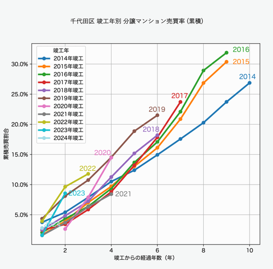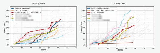 個別の分譲マンションごとの累積売買率について、竣工年別に分けて分析しました。たとえば、2014年竣工の「パークコート千代田富士見ザ・タワー」(505戸)は、5年経過時に約13.9%、10年経過時に約25.9%の累積売買率を記録しています。