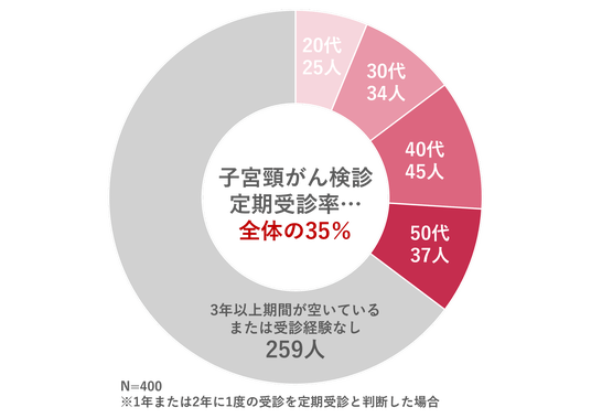 クレアージュが実施した調査では、20~50代の女性400名のうち子宮頸がん検診を受診したことがあるという女性は全体の47%でした。年齢別では40代の受診経験率が最多で、次いで50代が多い結果に。受診経験率が最も低い年代は20代で37%となっています。また、子宮頸がん検診は原則2年に1度の定期健診が大切ですが、2年に1度以上の頻度で定期的に受診できている女性は全体の35%で、約3人に1人の定期受診率であることが分かりました。