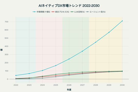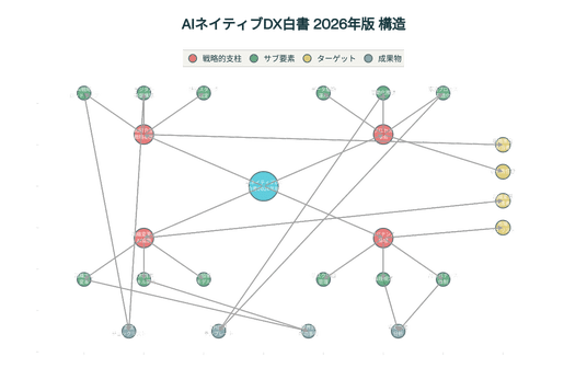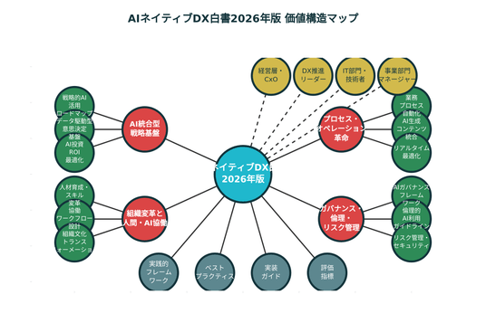 本白書は、静的DXからAIネイティブDXへの構造的転換を体系化した実践的フレームワークである。176章にわたり、AI変革進化マトリックス、AIファーストインフラ、自律的プロセス最適化、分散型AIガバナンス、人間・AI協働体制、生成AI・AIエージェント・RAGの戦略的位置づけ、エージェント型組織構造まで、DX再編の全領域を網羅する。AI統合型ビジネスモデル変革の構造・アーキテクチャ、実施形態、組織再編とワークフローモデル、成功指標・ガバナンス要件、適用ツール・モデル特性、成功事例、関与コンサルティング企業・手法、市場動向を章ごとに明示し、企業が「知能システム」へ進化するための具体的な道筋を提示する。