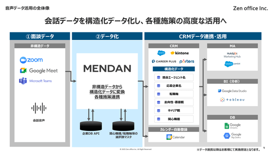 Zen office株式会社(本社:大阪市中央区、代表取締役:岩瀬 恭裕)は、人材紹介特化の音声×AIエージェント「MENDAN」に、新機能「音声データ施策活用」機能を追加いたしました。面談・商談の音声データから「競合エージェント名」「応募企業」「クロスセル機会」などを自動抽出し、CRM・BIツールと連携。データドリブンな競合対策と、顧客あたり売上・粗利の最大化を実現します。